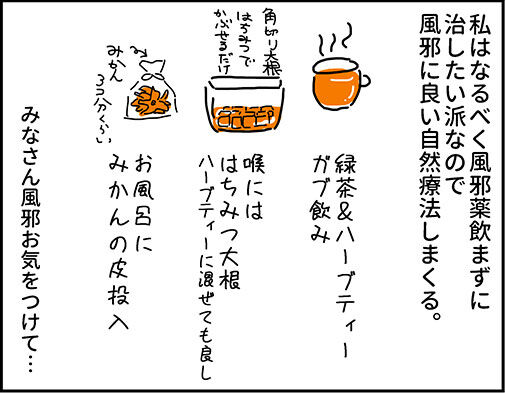 そして自然療法は私にはけっこう効くけど、インフルは病院で薬もらったほうがいいよ~~。