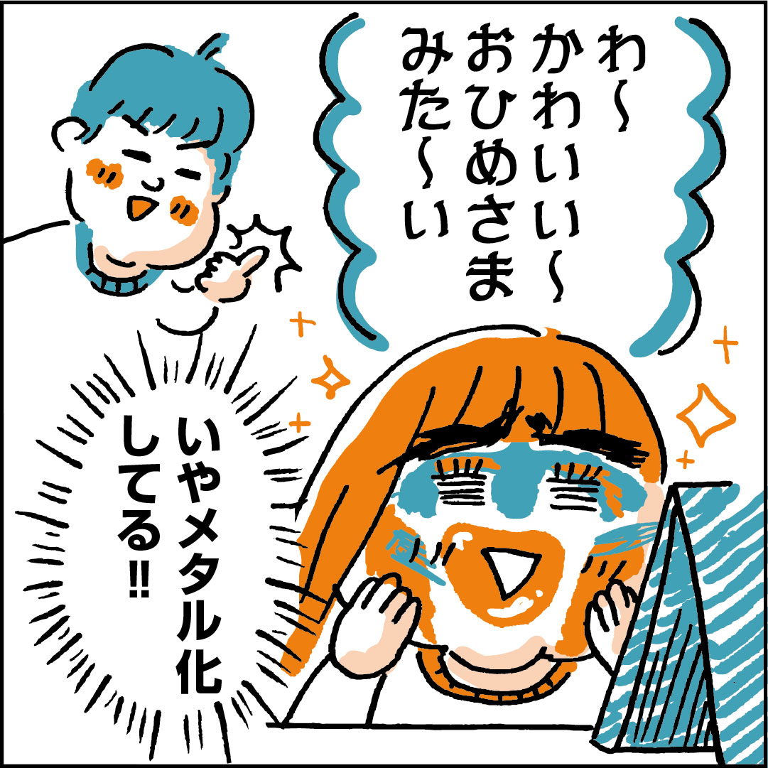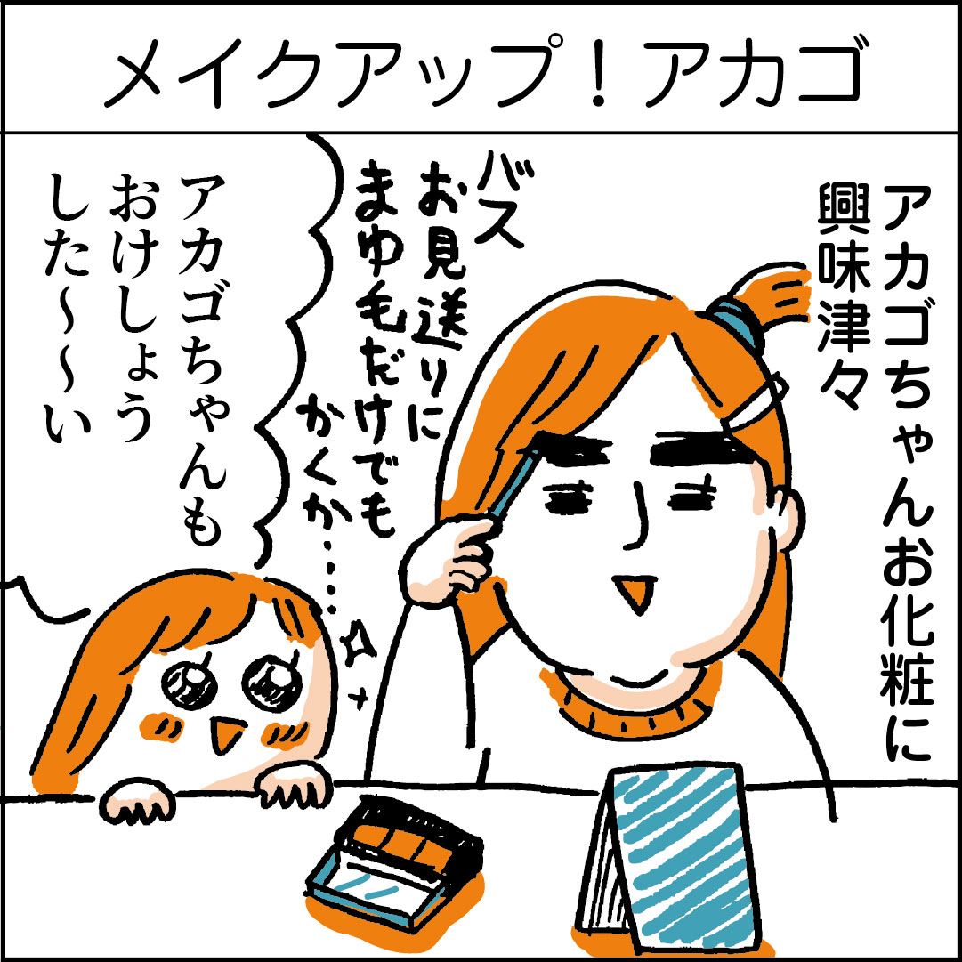 幼稚園ながらメイクをしたいアカゴちゃんには100均のメイクをちょいちょい買ってあげてお休みのときに自分でメイクして遊んでます。