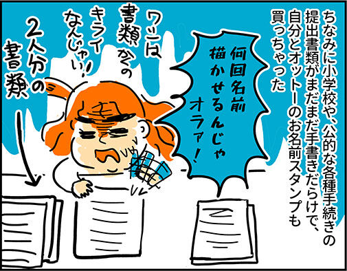 少しでも手間を省きたくて、保護者の名前欄用に自分とオットーのお名前スタンプ買っちゃった。