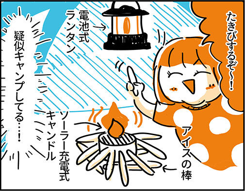 ↑寝るときの間接照明で使ってるこれと、アイスの棒で焚火をつくり、