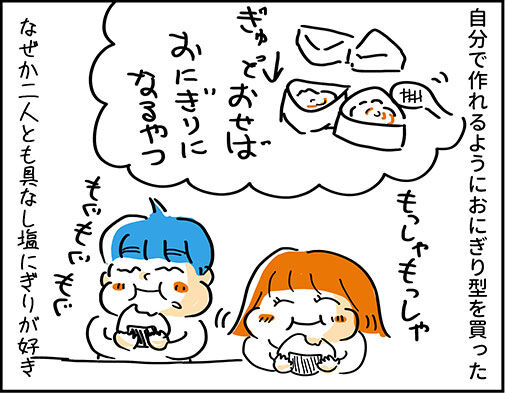 子供たち自分でおにぎり型と海苔だして、ご飯は私が入れてあげるけど自分で型にご飯入れて作るのが楽しいみたいだし^^